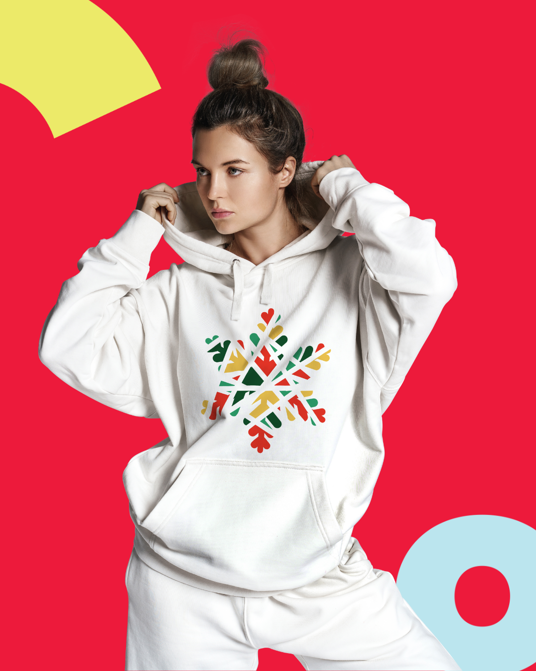 • Bold holiday graphics on dark hoodies